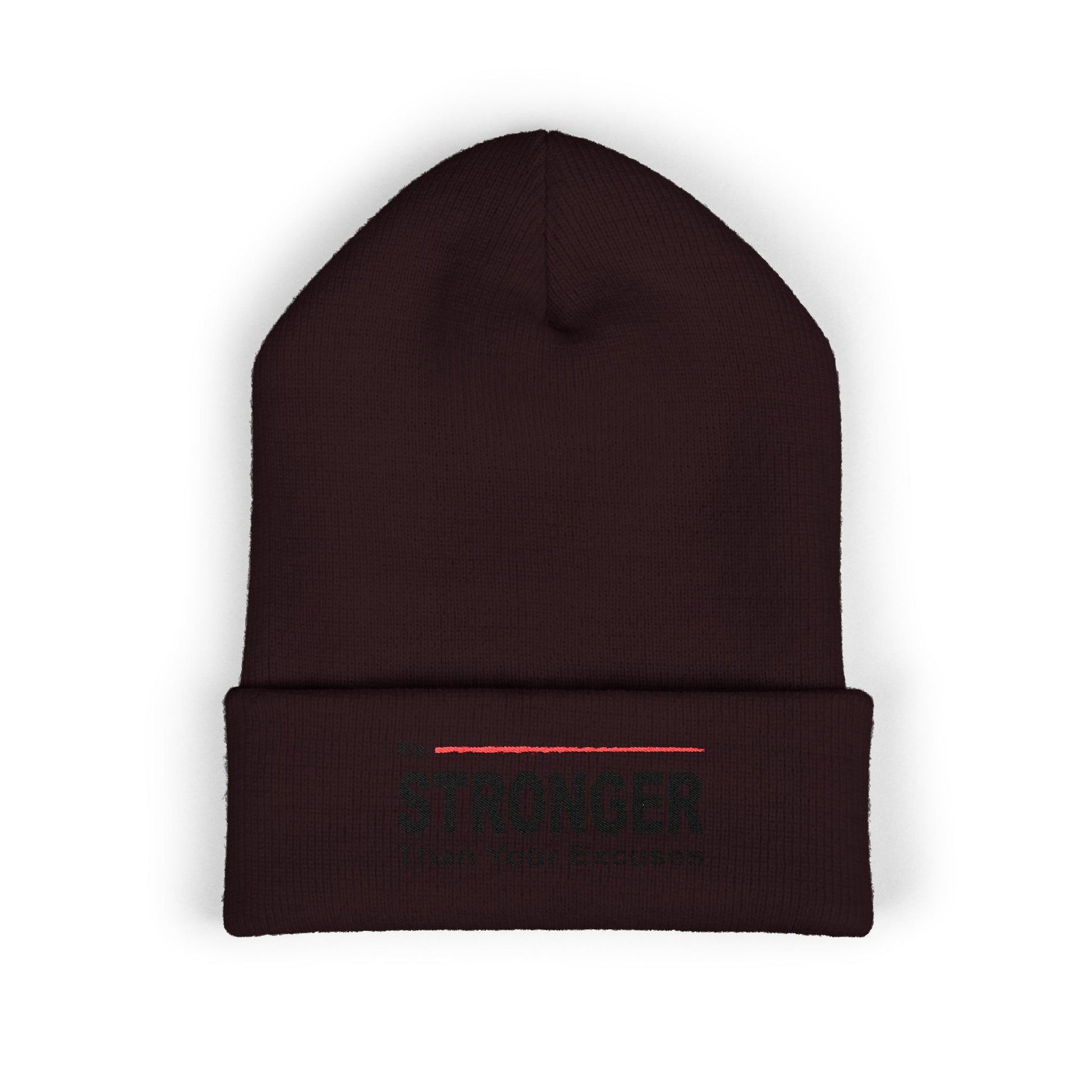 This cuffed beanie carries quiet confidence. Soft, stretchy turbo acrylic wraps your head in lightweight warmth while the embroidered message—Be STRONGER Than Your Excuses—sits low on the cuff like a subtle challenge. It settles into everyday life: pulled down on early runs, worn under a hood for extra warmth, or kept stashed in a gym bag as a small ritual before a workout. The narrow red line above the wording gives a minimalist, determined edge that reads like a badge of habit rather than loud branding. Hypoallergenic yarn keeps skin calm through long wear, and the one-size, 12" cuff gives a roomy fit that layers over short hair or tucks neatly under a coat. This beanie fits people who measure progress in reps and mornings, who appreciate functional gear that speaks to grit without shouting.