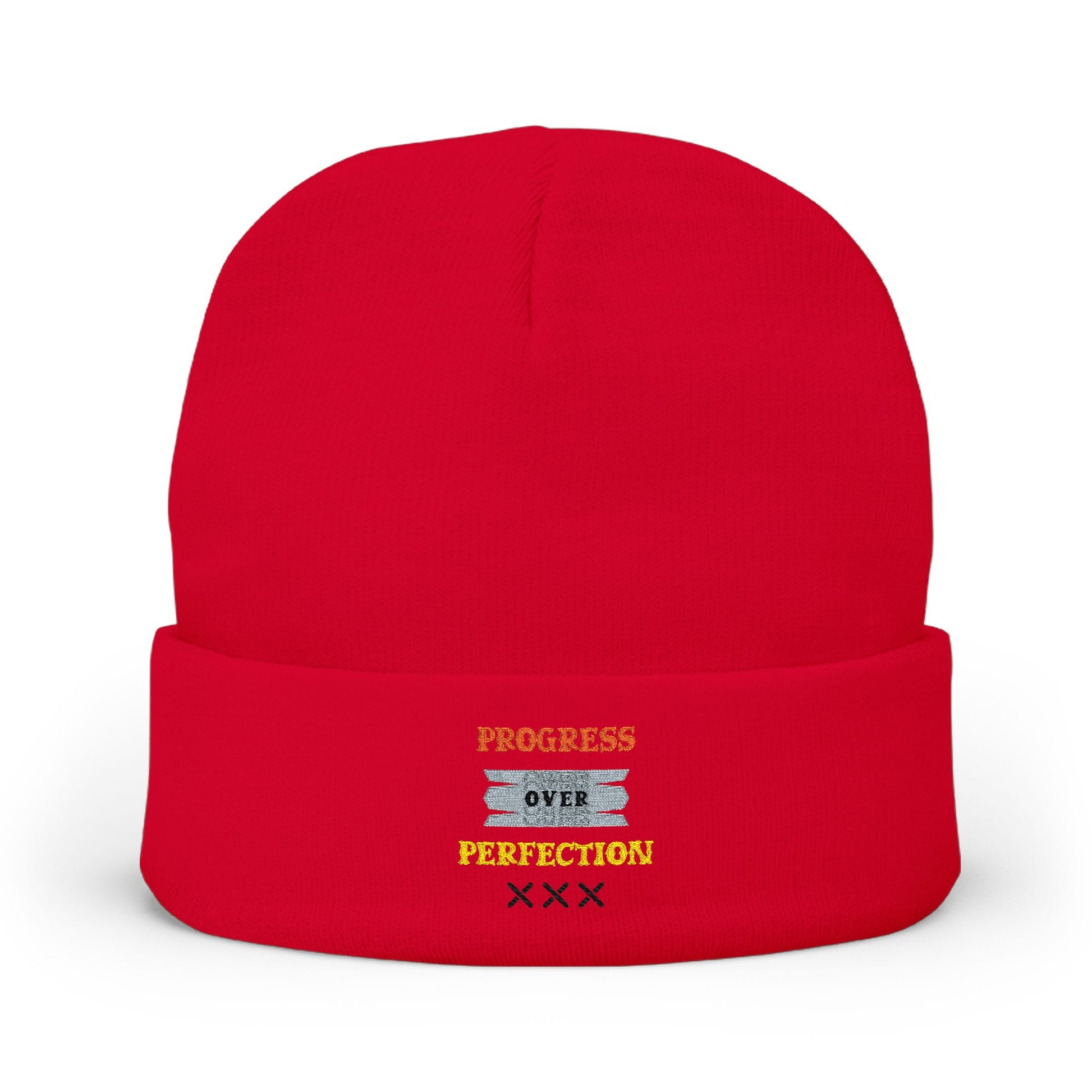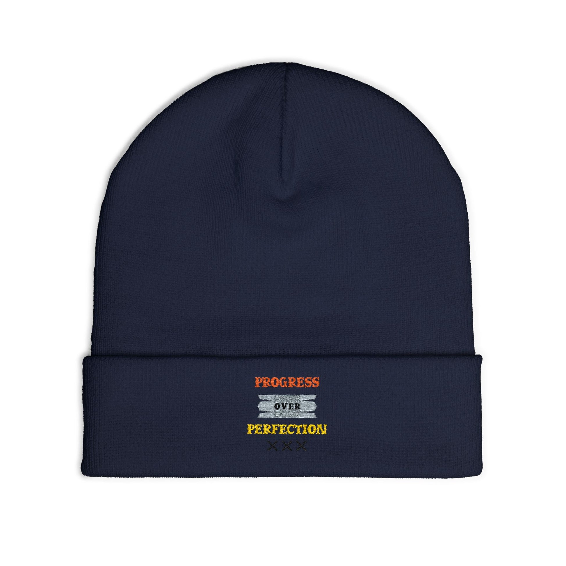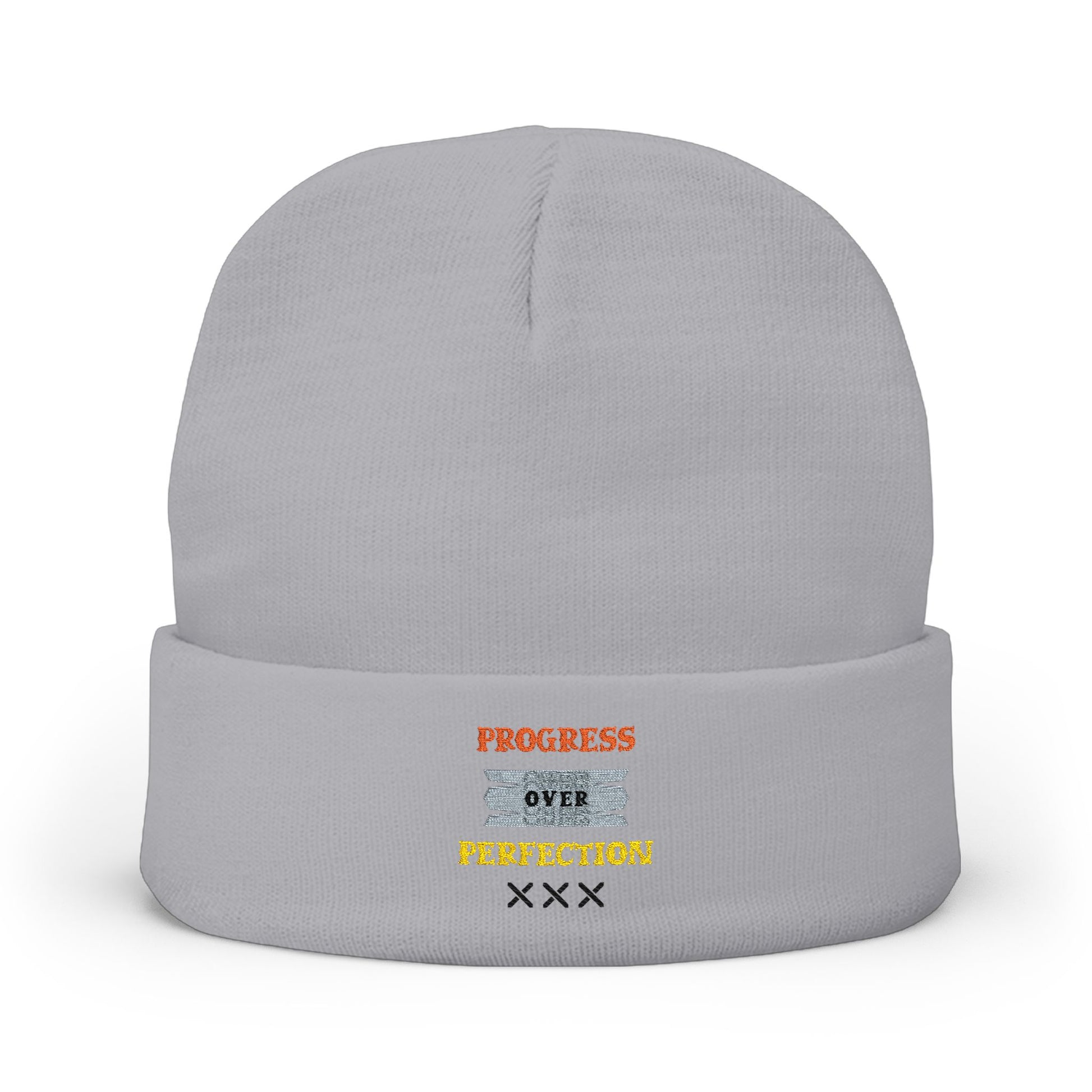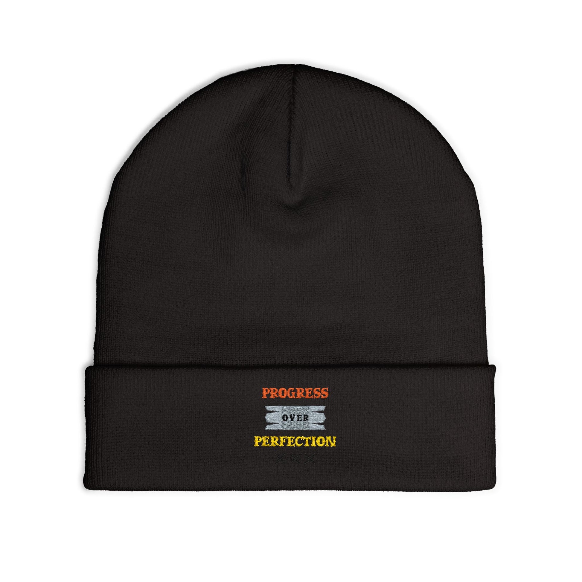 Embroidered Knit Beanie — 'Progress Over Perfection' Cozy Winter Hat