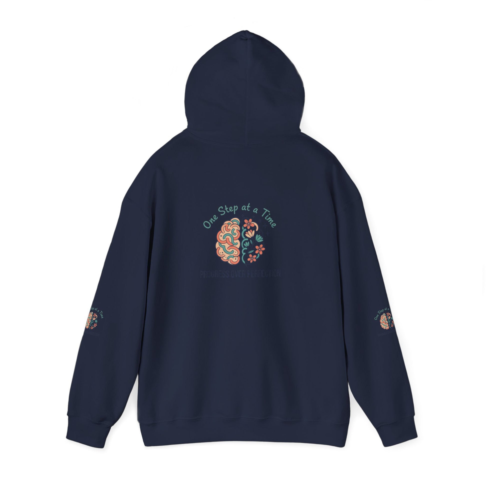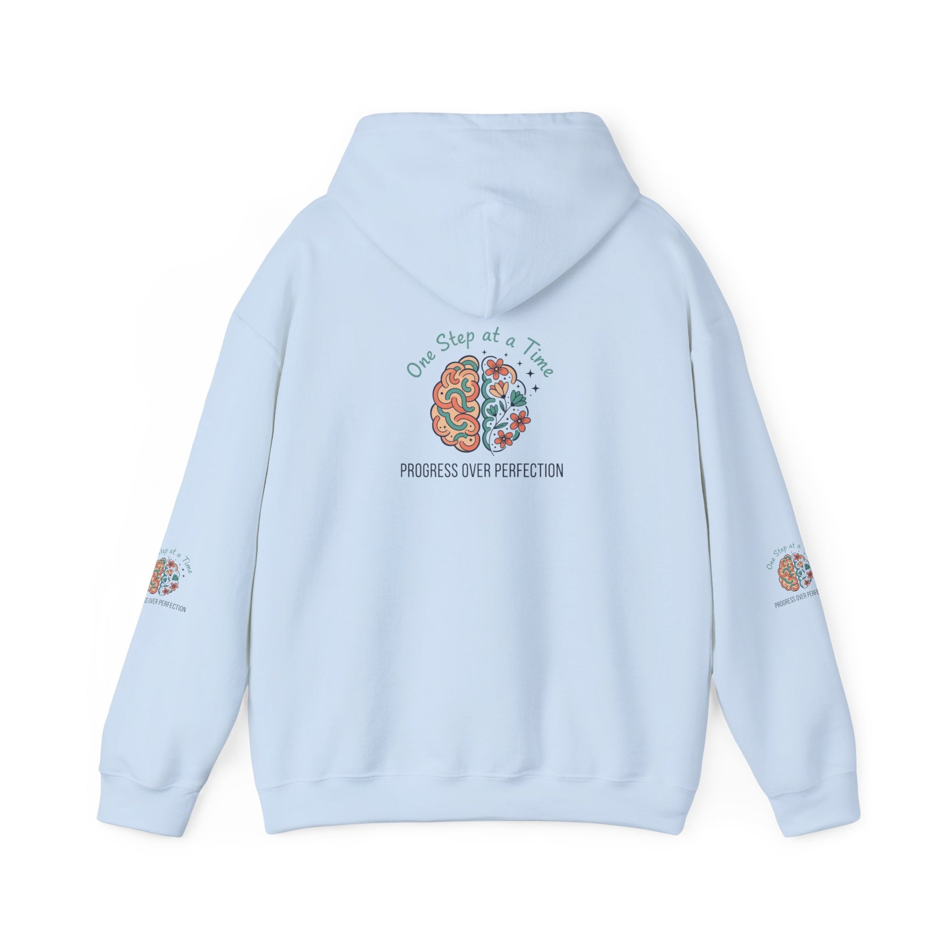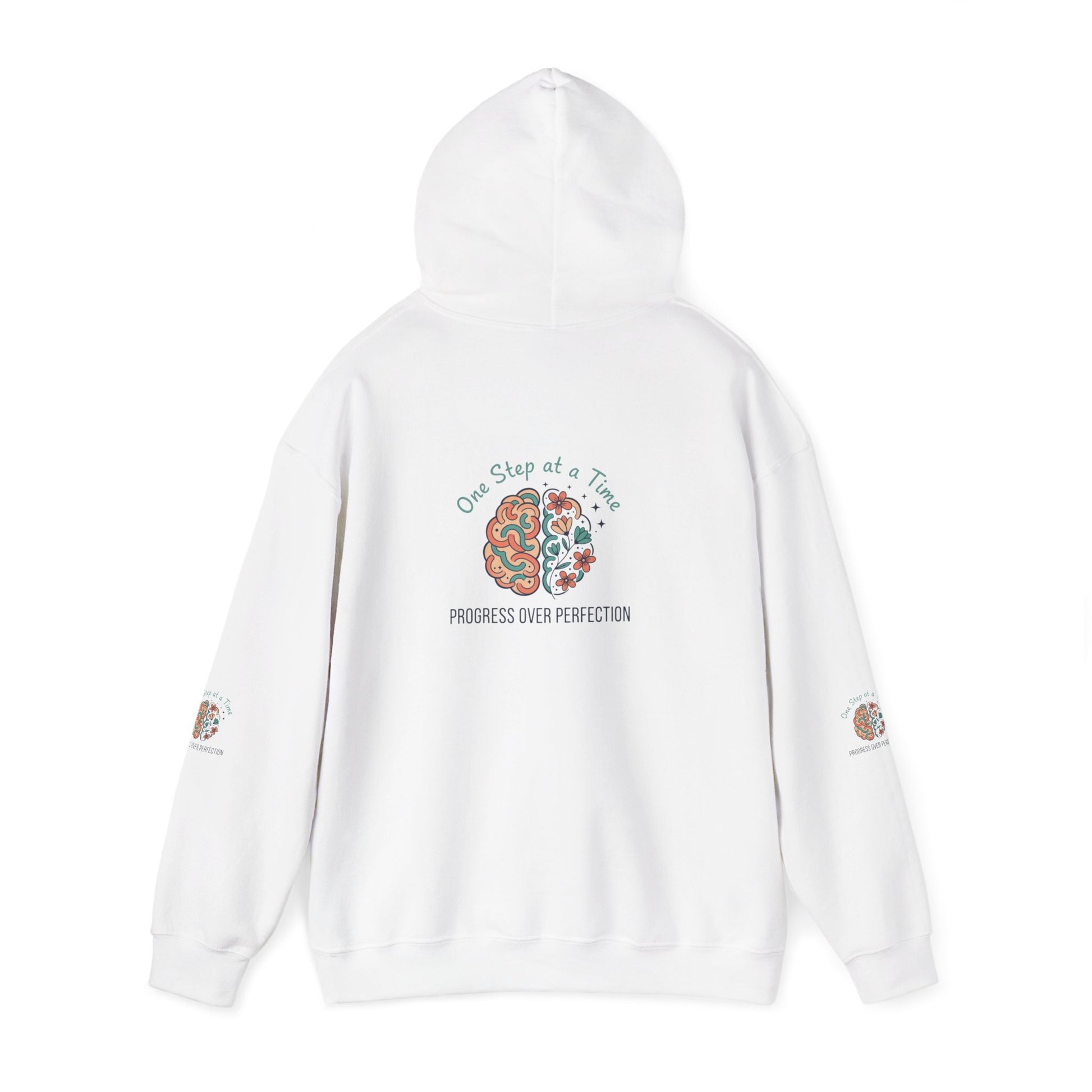Slip into a hoodie that quietly celebrates curiosity and steady growth. Soft, medium-weight fabric cradles you on brisk mornings while a gentle, hand-drawn brain-and-flower motif anchors the design—half circuitry, half blooms—accompanied by the phrase “One Step at a Time” and the subtler line “Progress over Perfection.” The graphics appear on the chest and back with matching sleeve accents, giving the piece a cohesive, thoughtful look. Wear it to study sessions, slow weekend walks, or cozy evenings when you need a reminder to keep going. The roomy kangaroo pocket and double-lined hood add comfort and function without stealing the spotlight from the artwork. It’s made to layer, linger in, and return to whenever you want a calm nudge forward.
