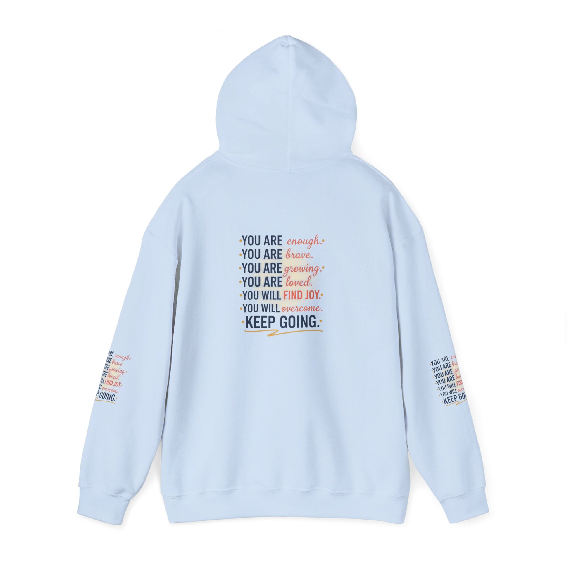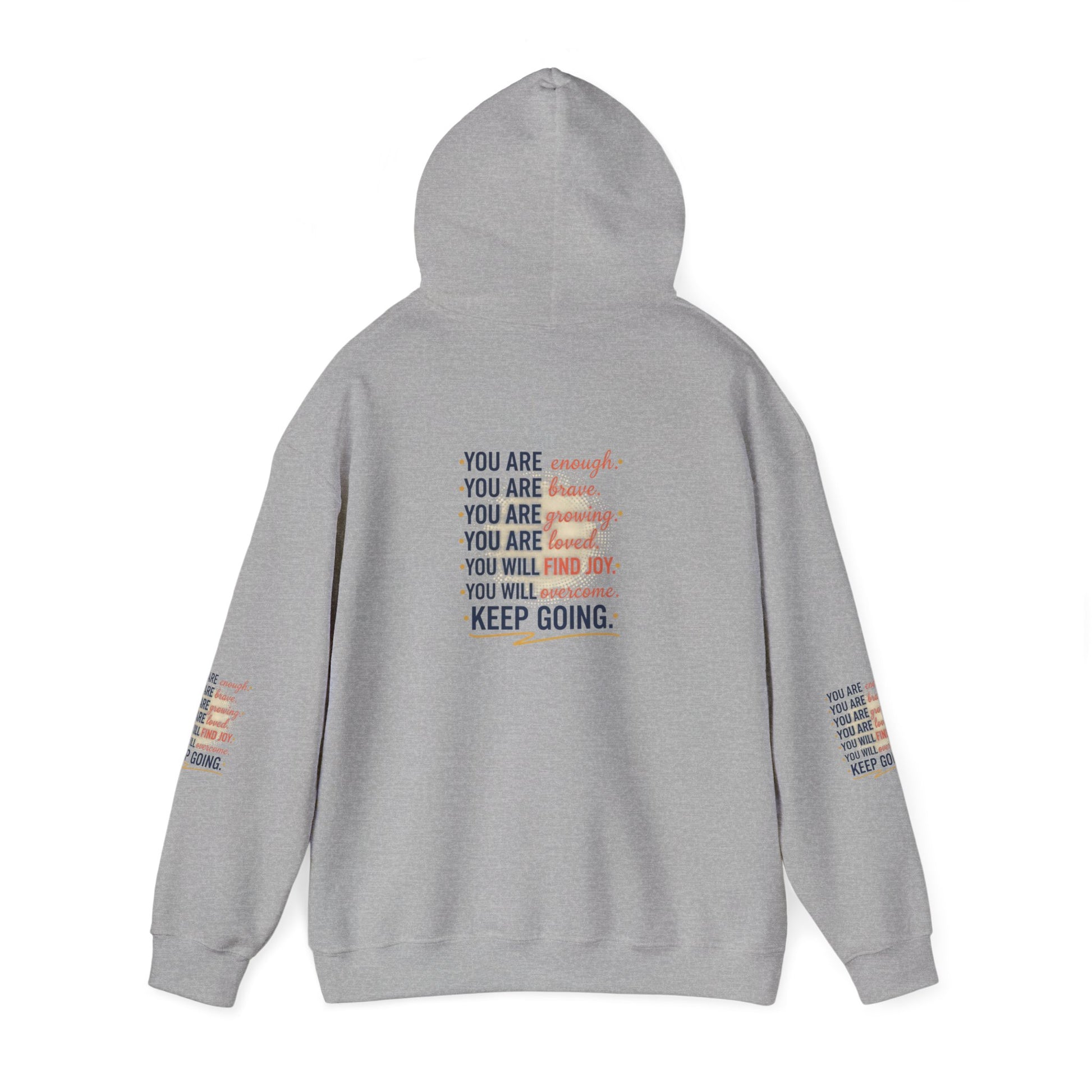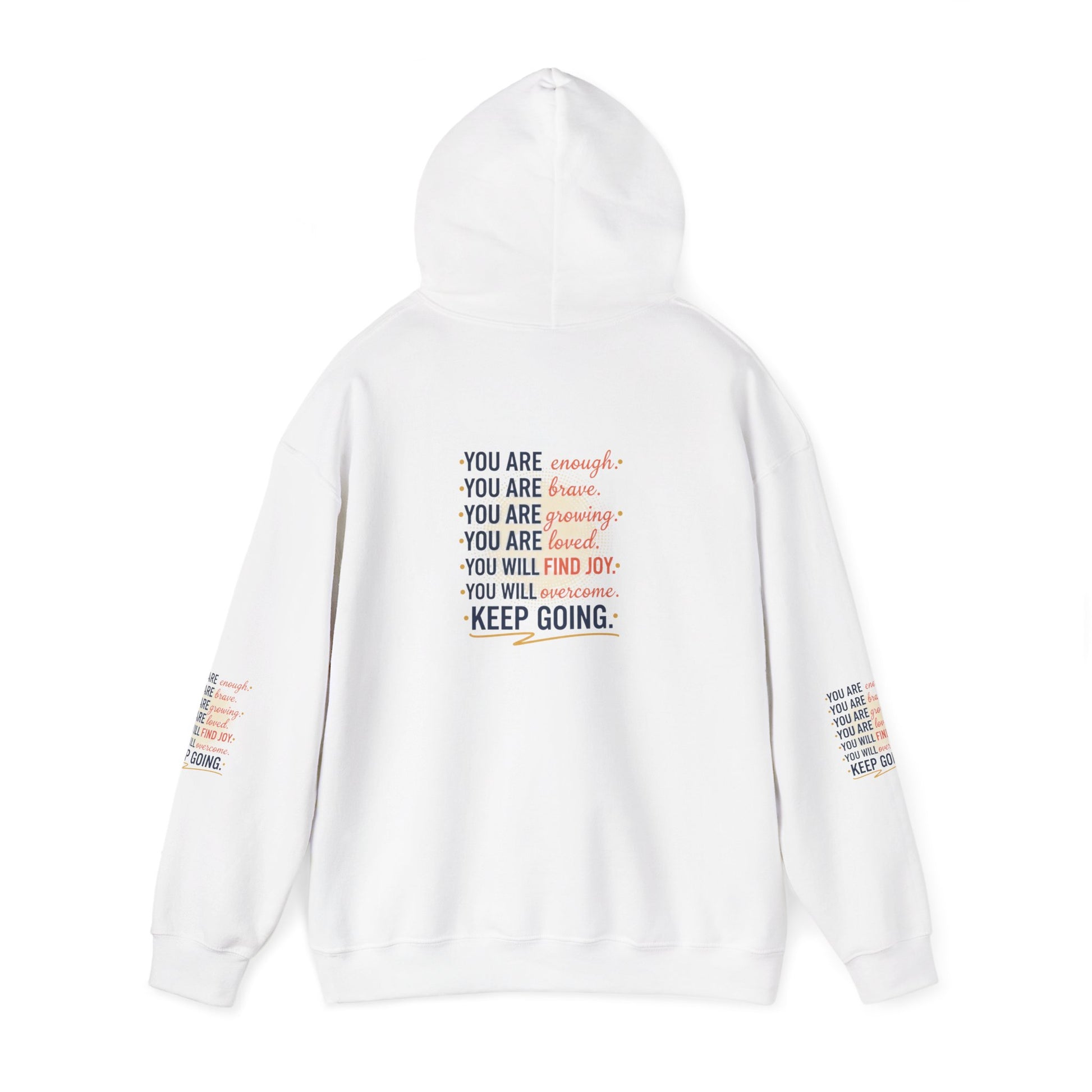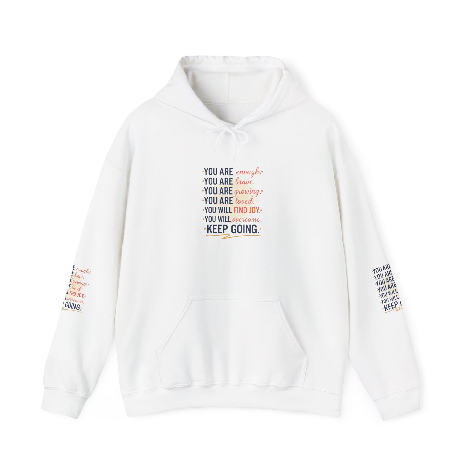 This cozy hoodie carries a quiet, steady message — gentle reminders printed across the chest and sleeves: you are enough, you are brave, you are worthy, you will find joy. The soft 50/50 cotton–poly blend feels warm without weighing you down, and the double-lined hood and color-matched drawcord make it feel thoughtful and finished. The roomy kangaroo pocket keeps hands warm and the tubular knit (no side seams) gives clean lines and less waste. Subtle wrist and sleeve prints add texture and a layered look that reads like a personal mantra whenever you move. Wear it on slow mornings, long walks, or afternoons when you need a small, wearable boost of encouragement.