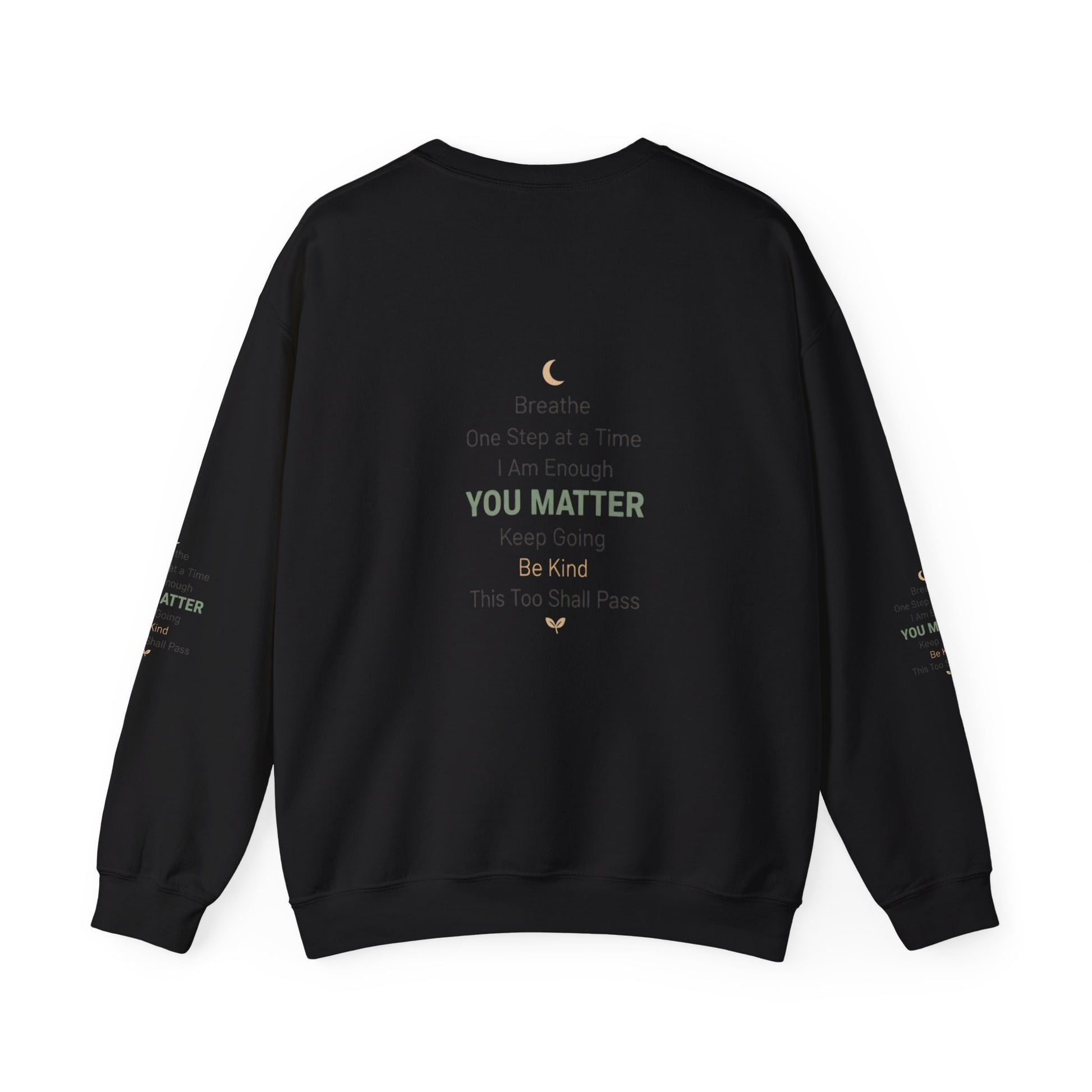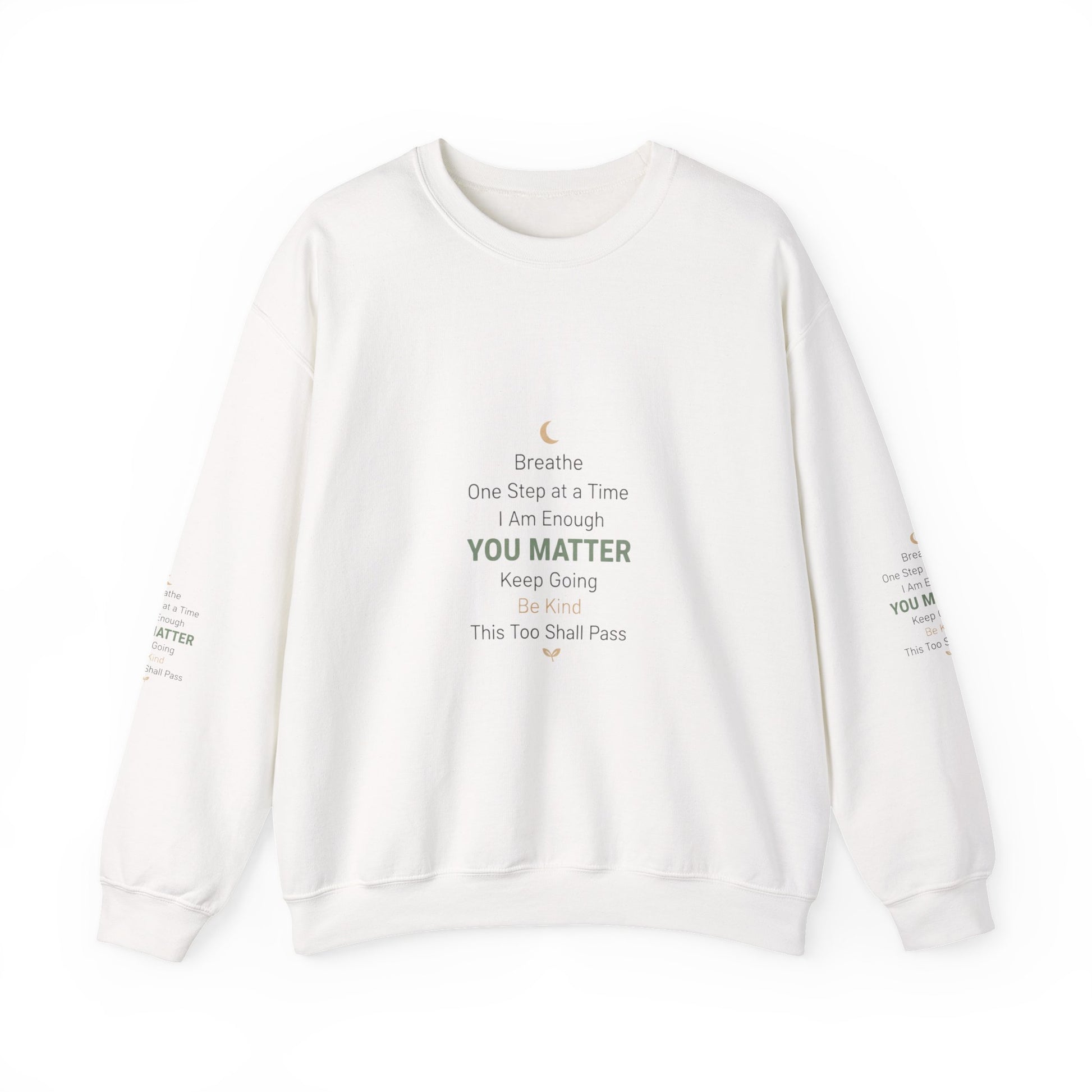 Soft, steady, and quietly encouraging — this crewneck wraps you in calm when days feel heavy. The gentle front-and-back square print features short, hopeful prompts (“Breathe,” “You Matter,” “Keep Going”) in muted greens and beige, while small matching panels on each sleeve give the message a wearable rhythm. Lightweight but substantial, the sweatshirt settles in like a reliable friend: warm without weight, simple without shouting. It’s built to be lived in — mornings with coffee, slow walks, or evenings on the couch — and to remind whoever wears it that small breaths add up to real strength.