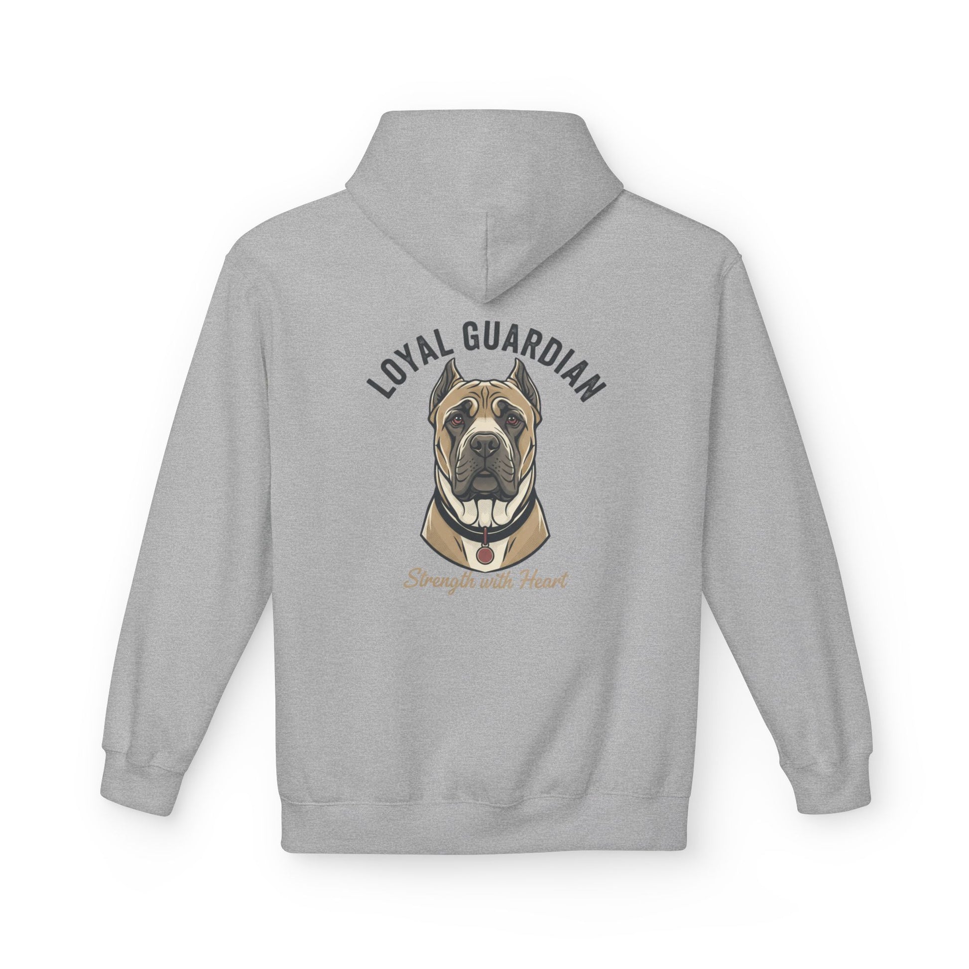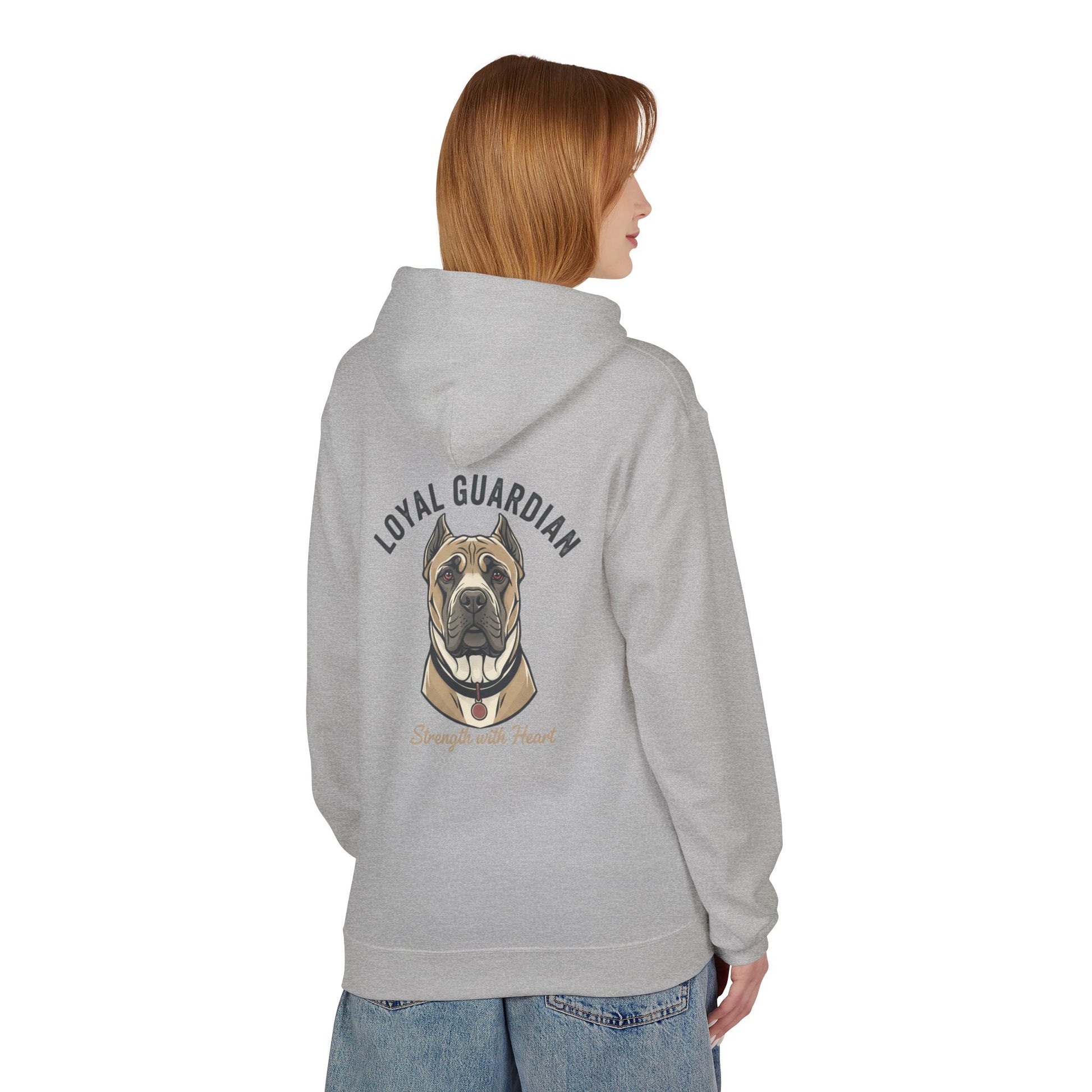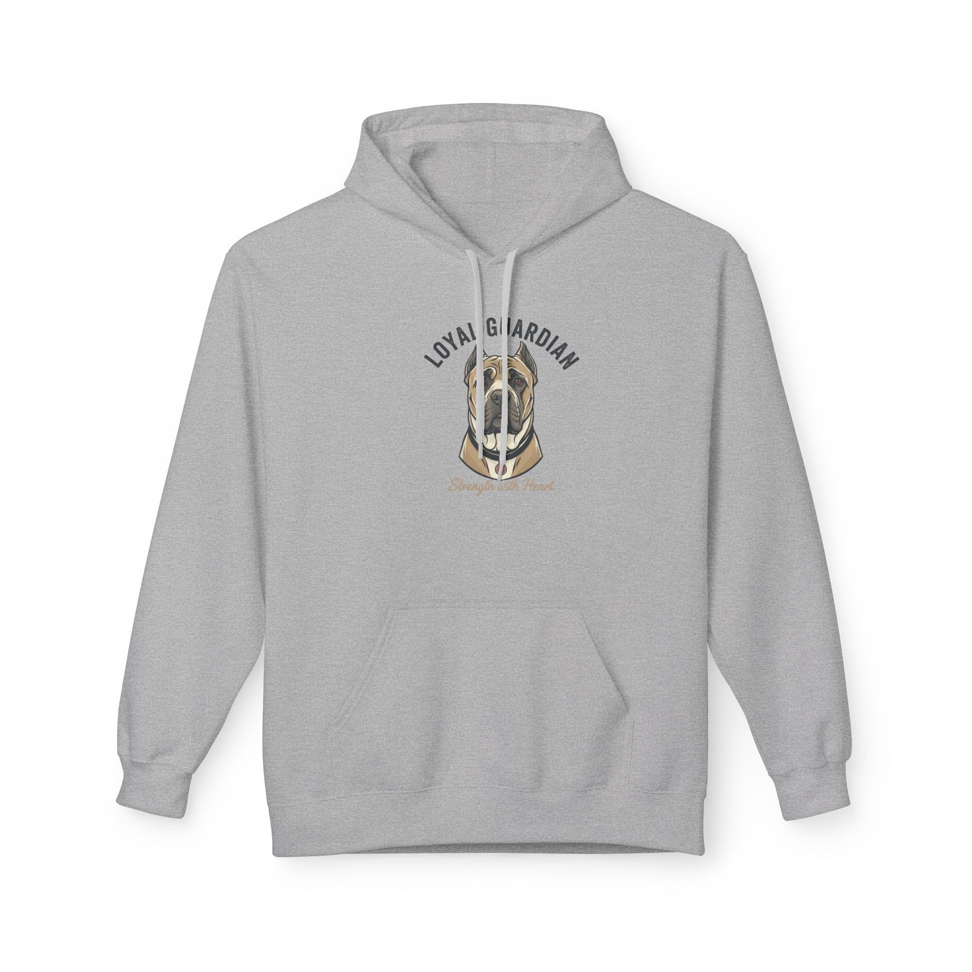 Warm, sturdy, and quietly bold — this midweight fleece hoodie carries a hand-drawn portrait of a devoted mastiff with the words “LOYAL GUARDIAN” arched above and “Strength with Heart” below. The roomy pouch pocket and dropped shoulders give it a lived-in comfort that invites slow mornings with your dog, evening walks, or relaxed weekends on the porch. The soft cotton face and substantial 8.4 oz fabric keep the print crisp while the two-piece lined hood adds extra warmth for blustery days. Thoughtfully made in OEKO-TEX and socially certified facilities, this hoodie feels as responsible as it does comforting — for people who value resilience, quiet protection, and the steady company of a loyal canine.