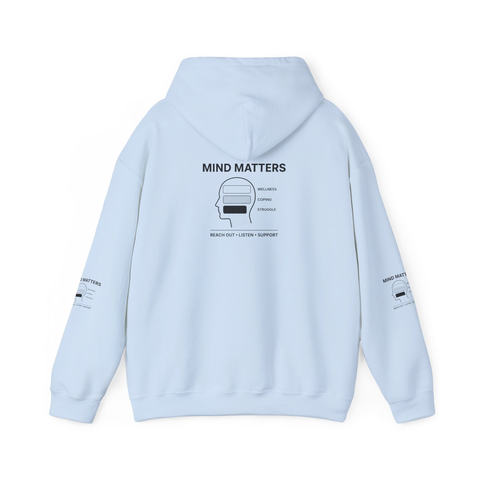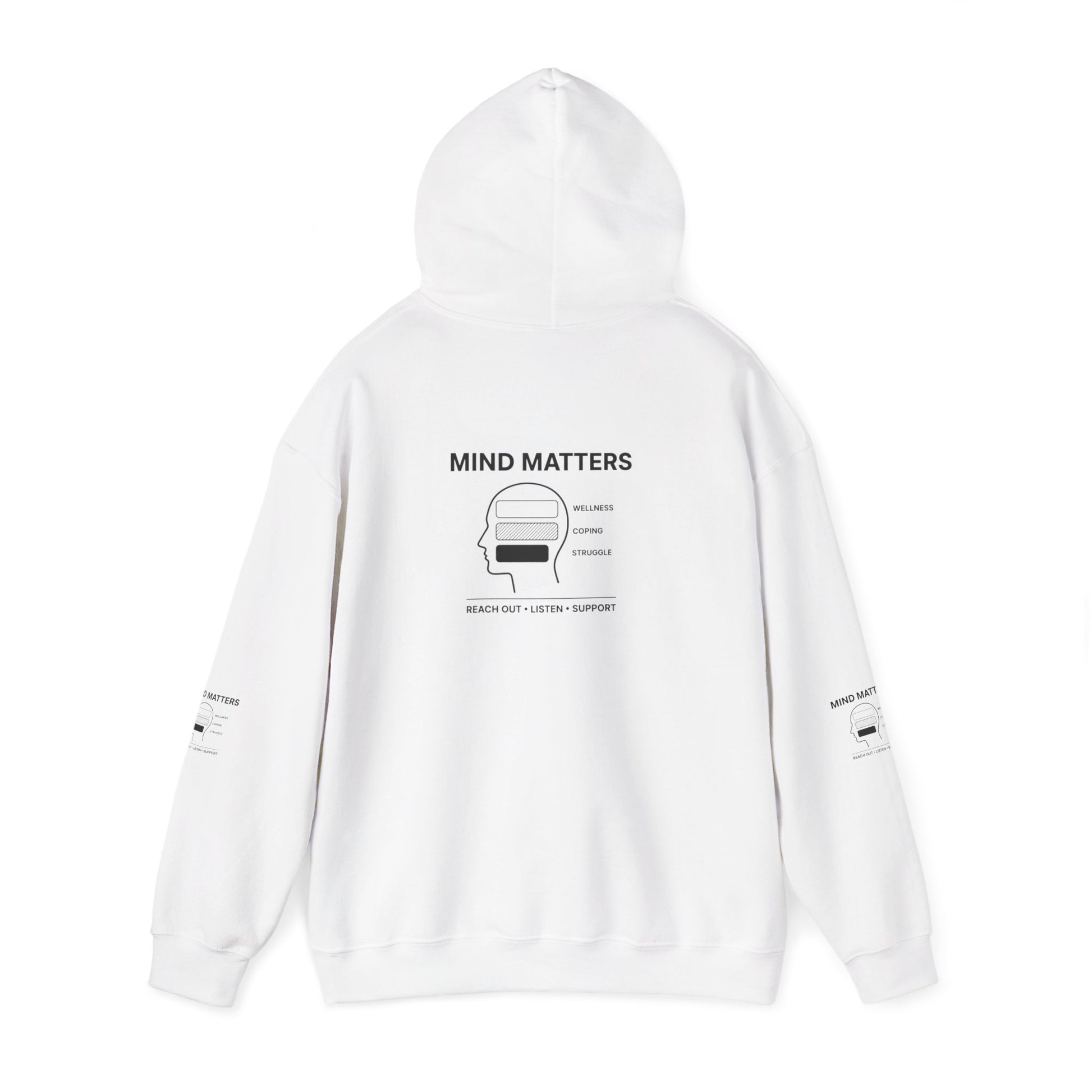 This cozy hoodie carries a quiet, thoughtful energy. The clean white fabric frames a minimalist illustration and the words “MIND MATTERS,” inviting moments of pause and reflection. Subtle sleeve and wrist graphics extend the design without shouting — they feel like small reminders you meet throughout the day. Wear it during solo walks, late-night study sessions, or while settling in with tea and a journal. The roomy pouch pocket and double-lined hood hold warmth and comfort, while the soft, medium-heavy fabric keeps you settled on cooler mornings. It’s for people who value calm clarity and small, purposeful details in their everyday wardrobe.