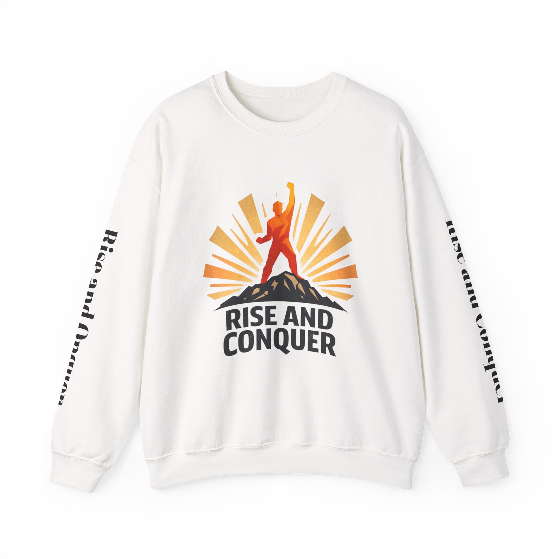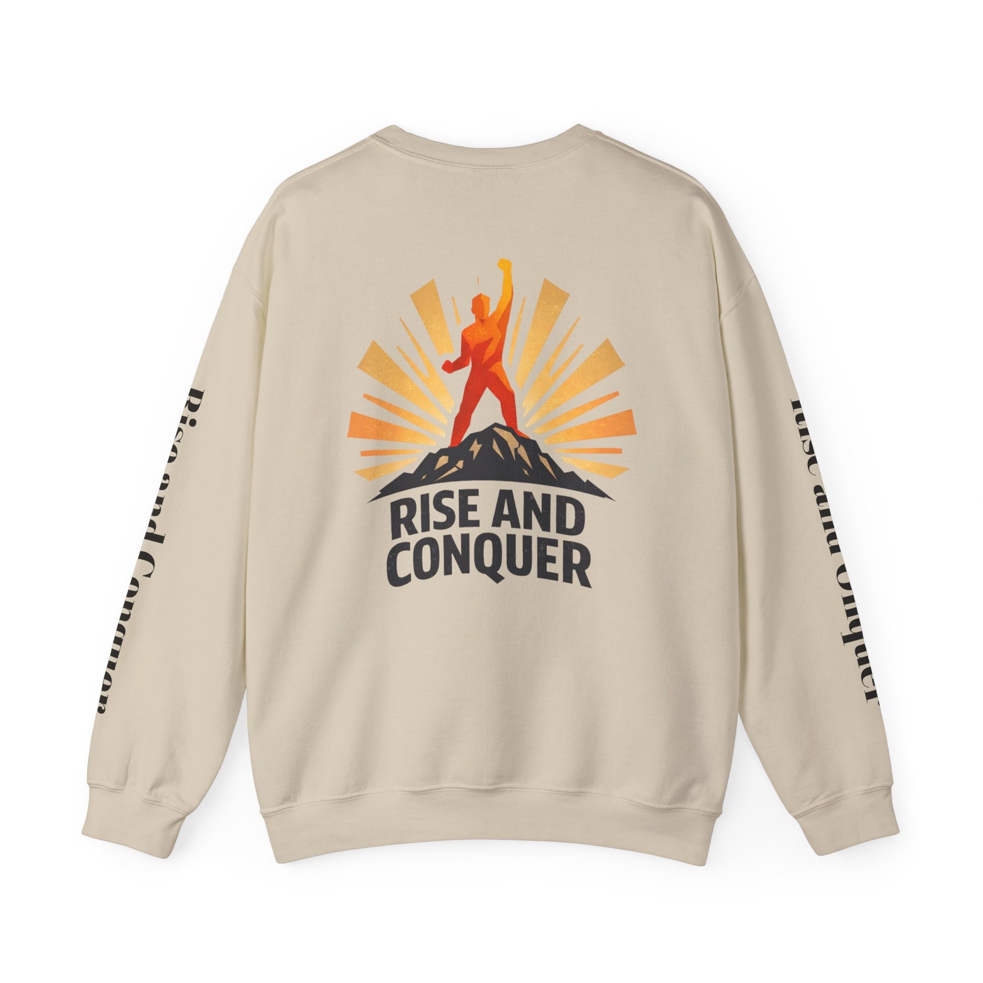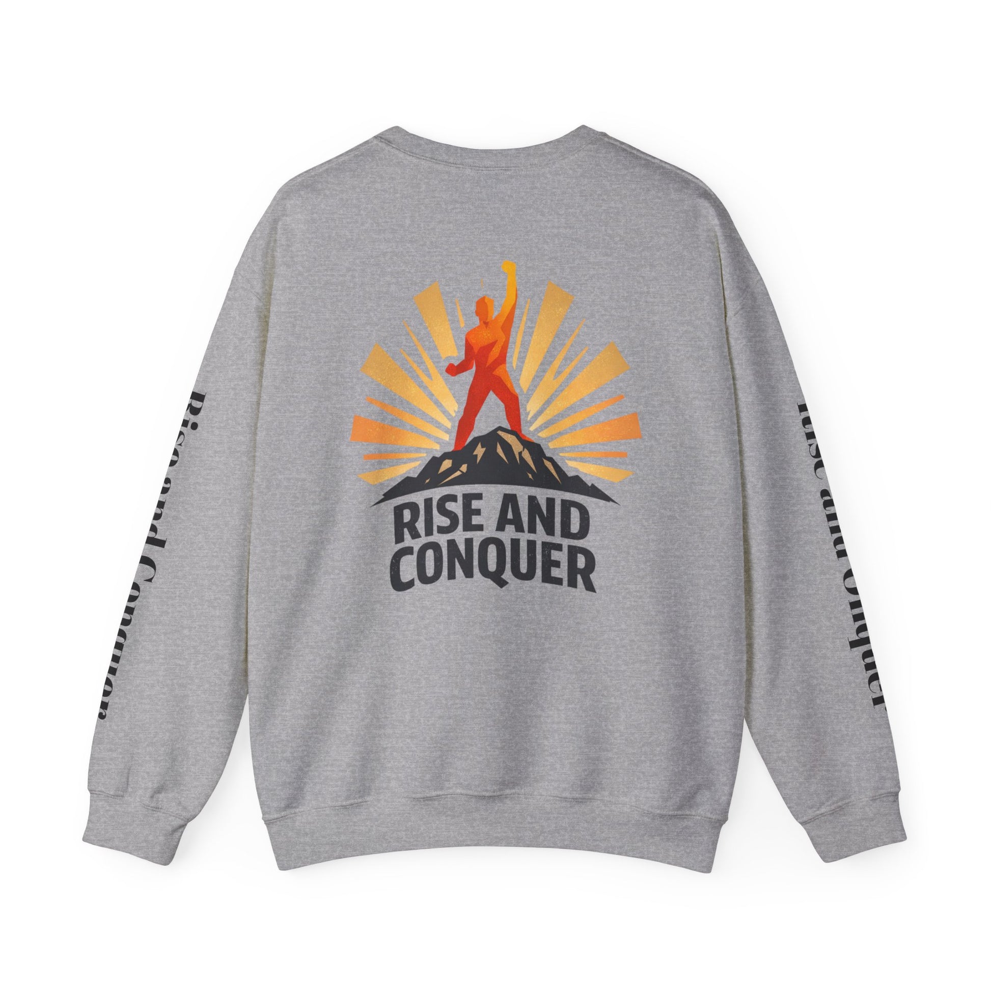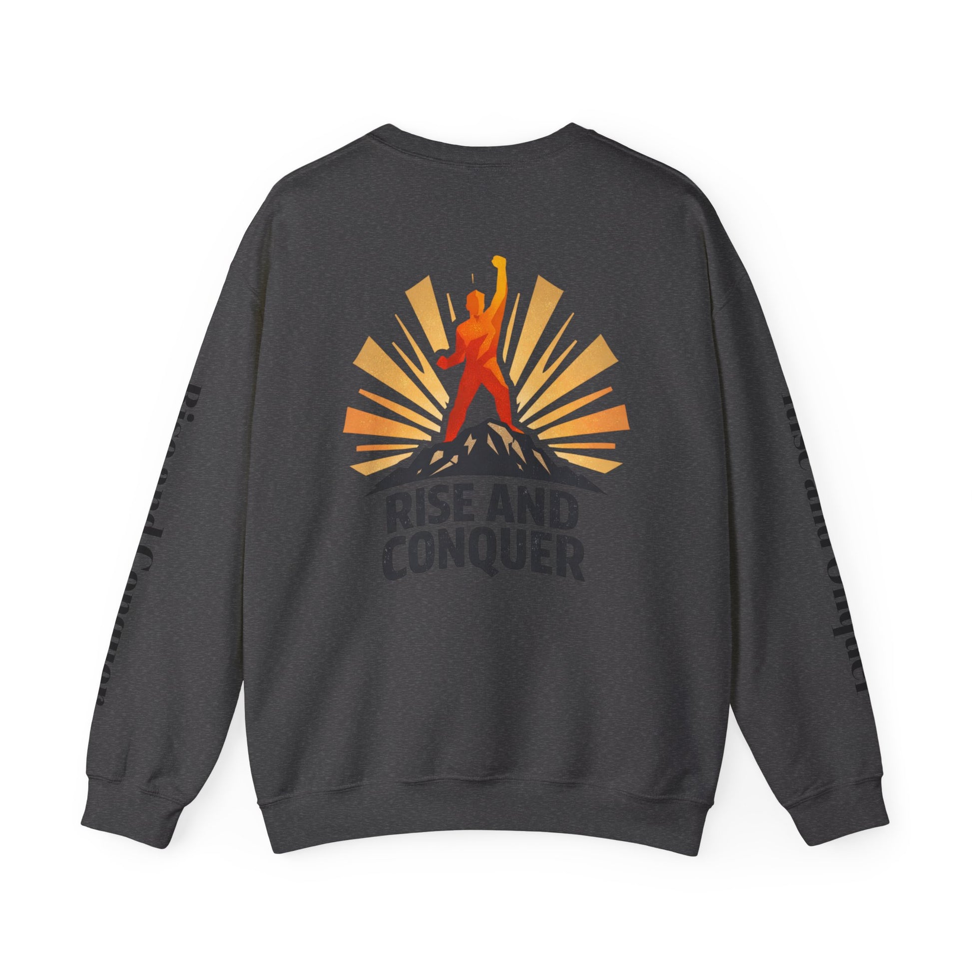 This mid-weight crewneck brings quiet confidence to everyday wear. A bold graphic of a figure standing triumphant on a summit radiates warm sunrise tones across the chest and back, paired with subtle type along the sleeve. The 50/50 cotton-poly blend and ribbed collar hold shape through repeated wear. Thoughtful construction — tubular knit, double-needle stitching, and tear-away label — keeps the fit clean and comfortable. Embroidery options are available for a textured, elevated look at chest or wrists, and all inks and dyes meet OEKO-TEX and safety standards.
