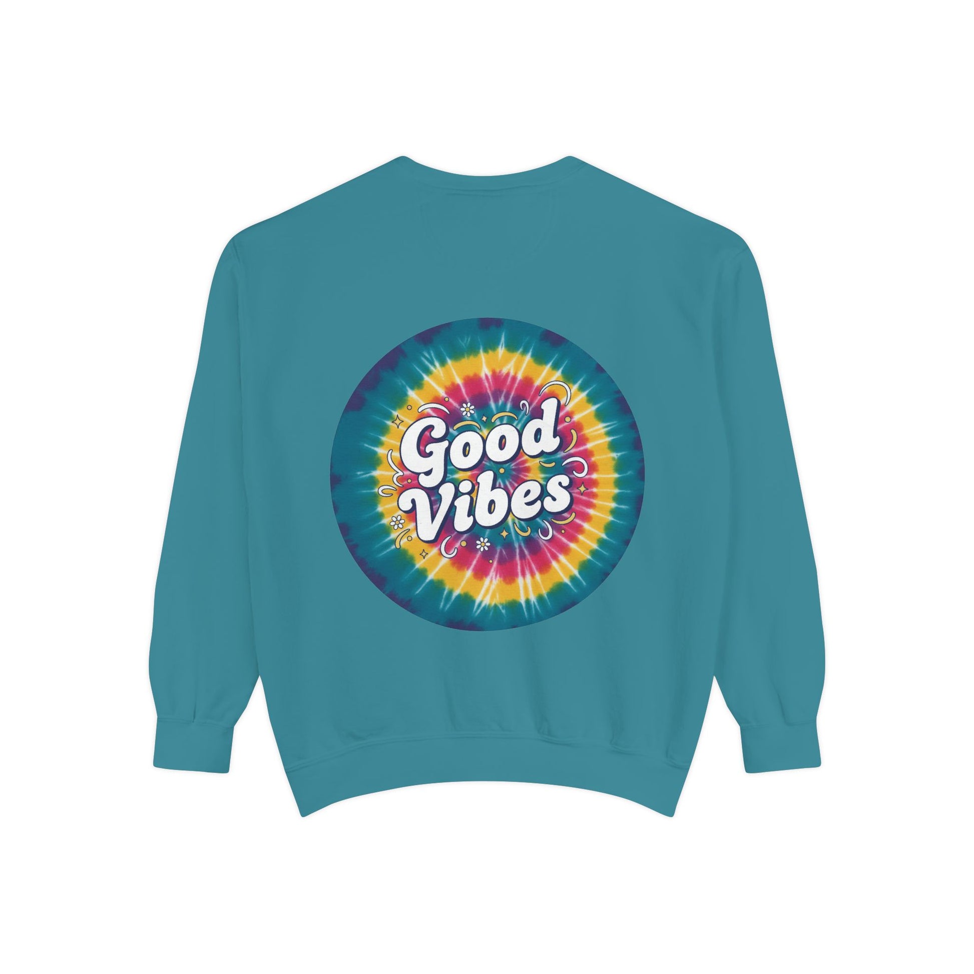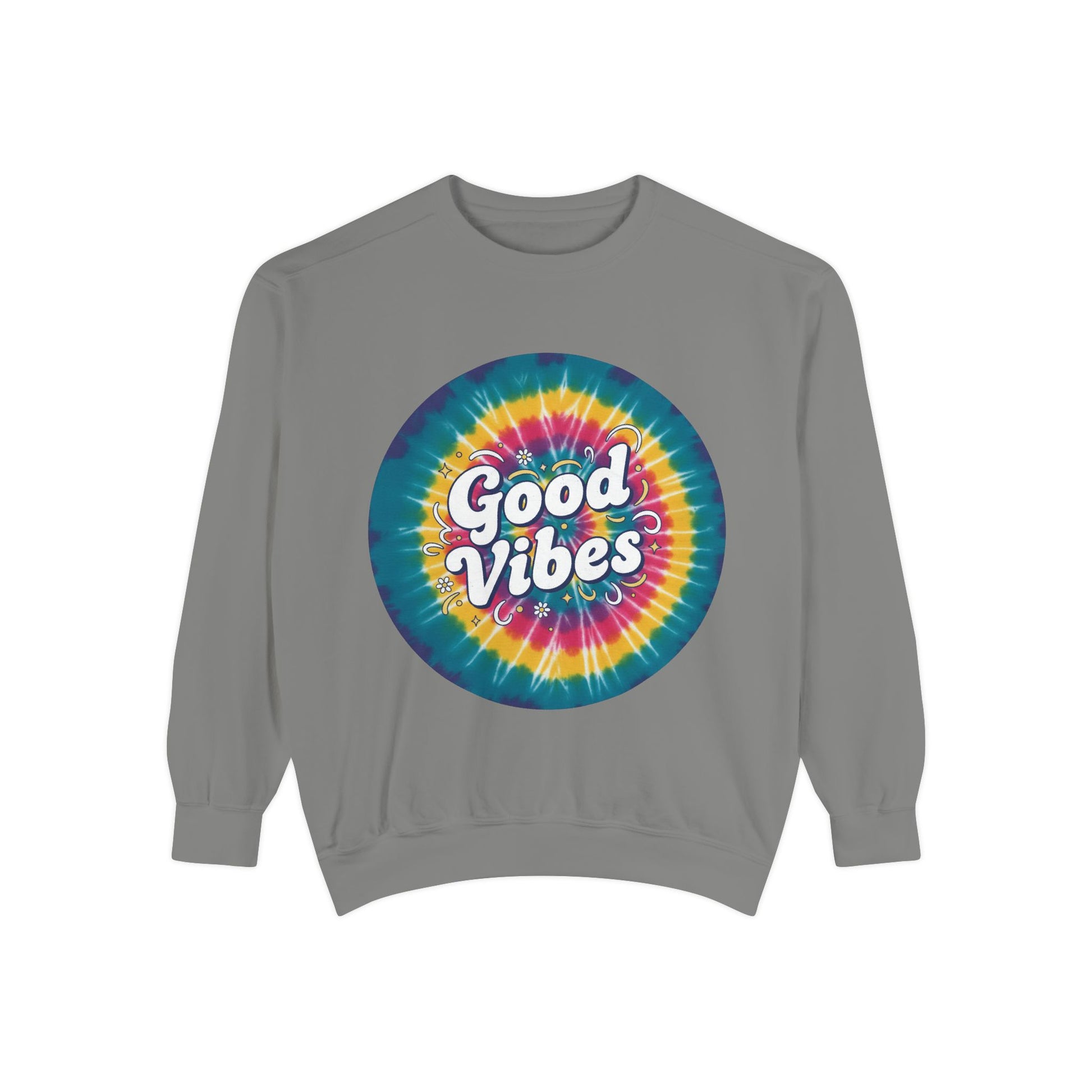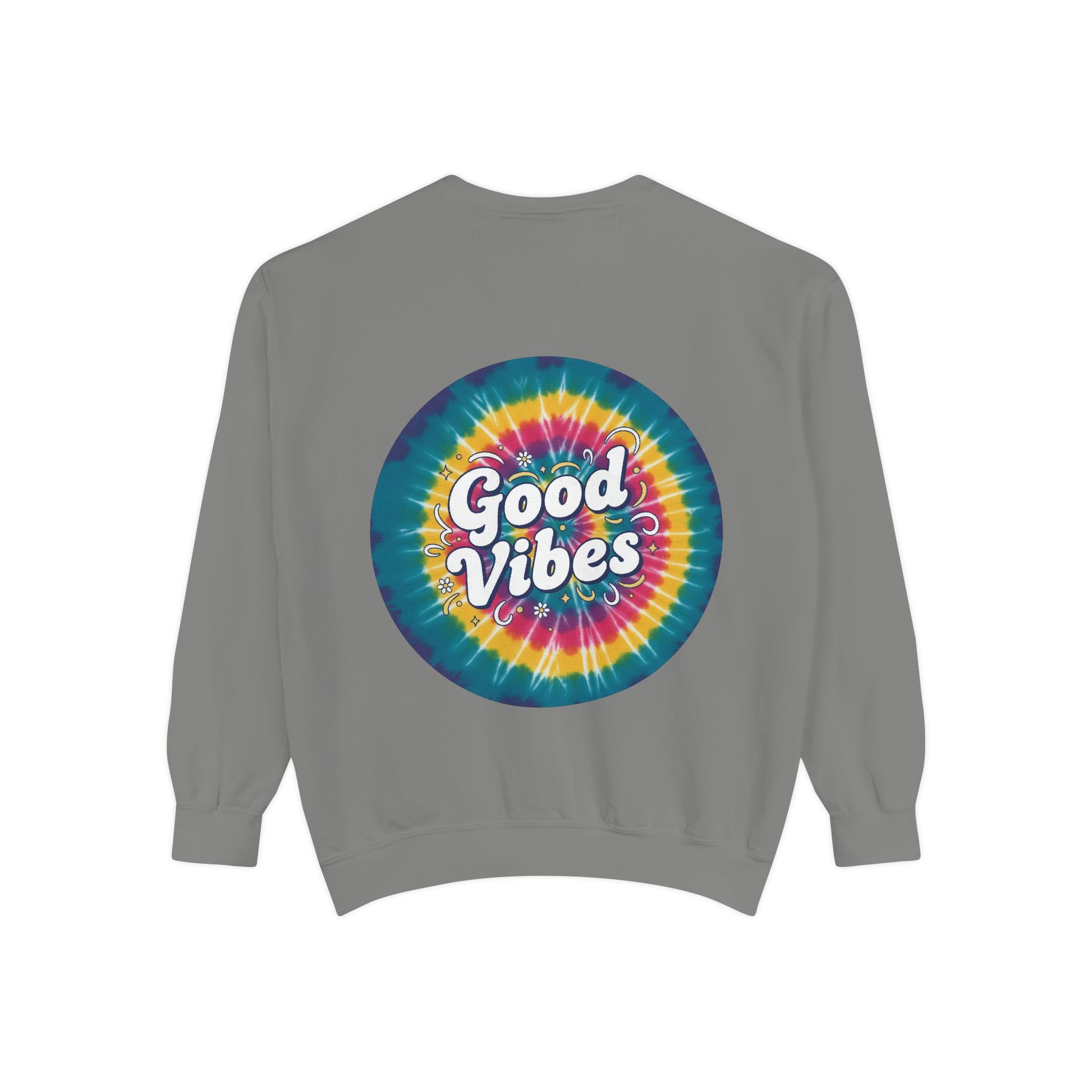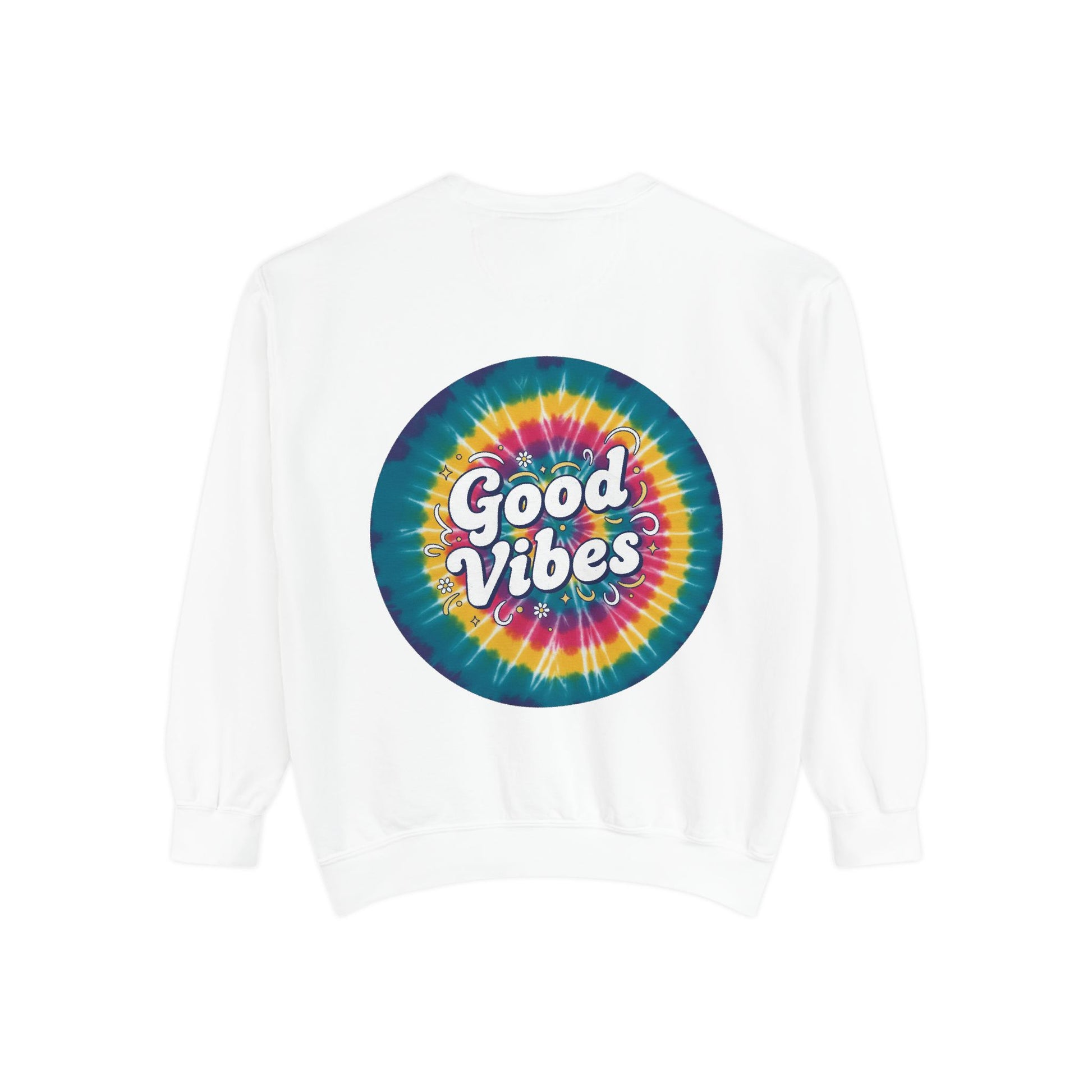 This relaxed-fit sweatshirt brings a splash of retro brightness to everyday wear. A bold, circular tie-dye print blooms across the chest and back, with hand-lettered “Good Vibes” nestled at its center. The medium-heavy 80/20 ring-spun cotton-poly blend feels substantial yet soft — it drapes easily, holds print and embroidery well, and settles into a lived-in comfort after a few wears. Practical details like ribbed collar, cuffs, and hem with necktape and a half-moon back patch keep the shape steady while the sewn-in twill label and OEKO-TEX low-impact dyes add quiet quality. Wear it to slow afternoons, festival mornings, or evening bonfires when you want color that feels like a friendly soundtrack.
