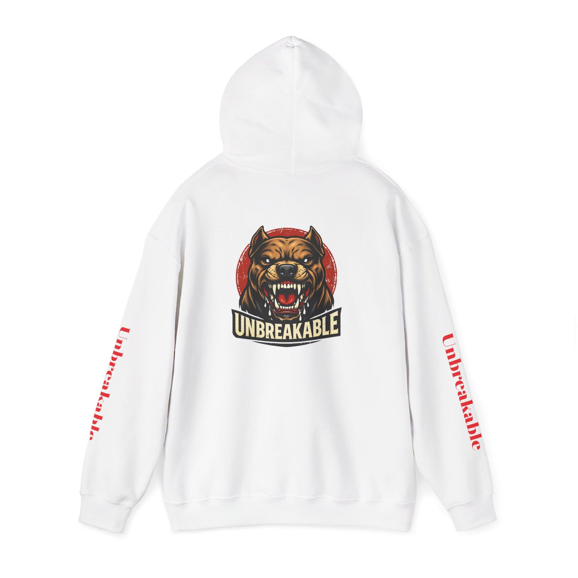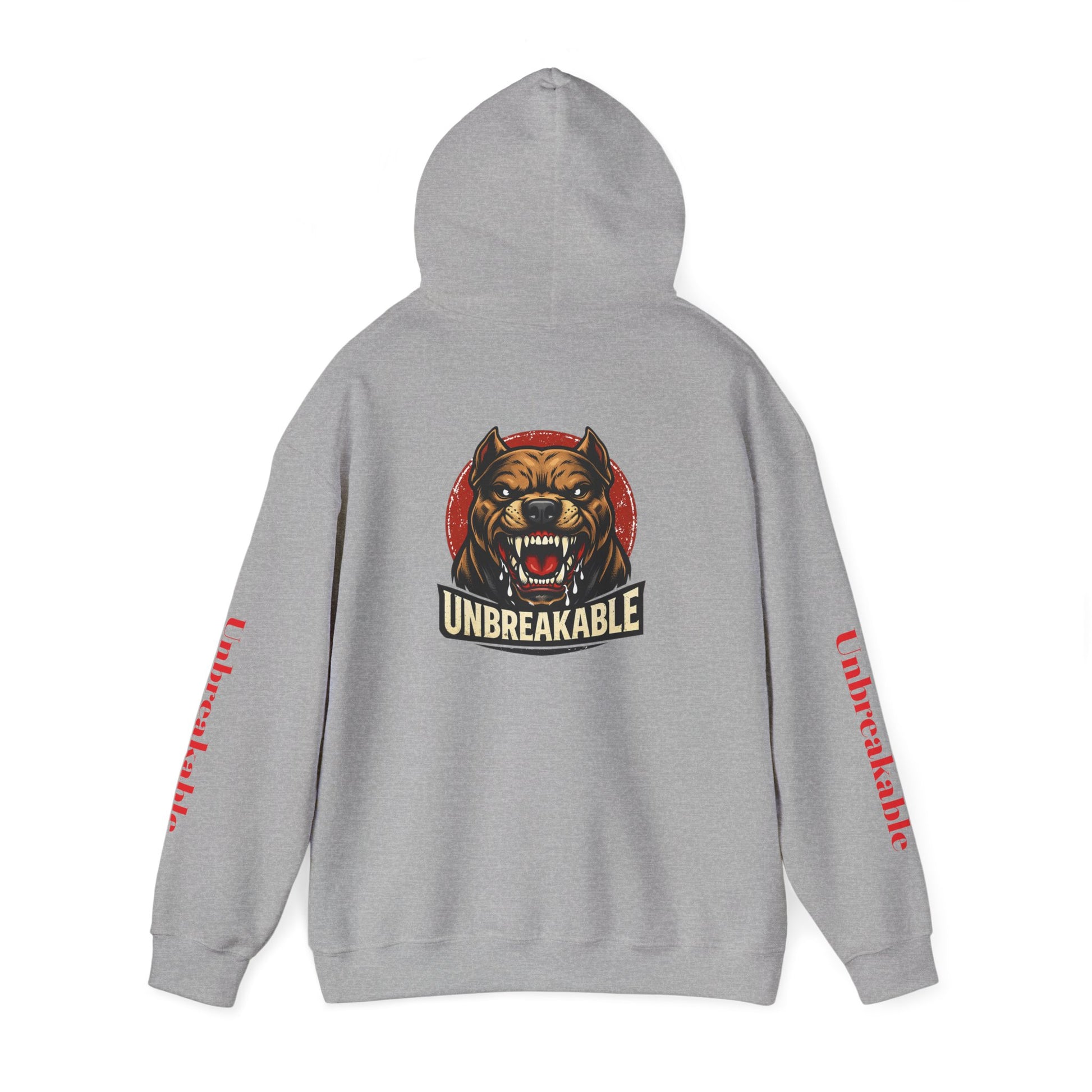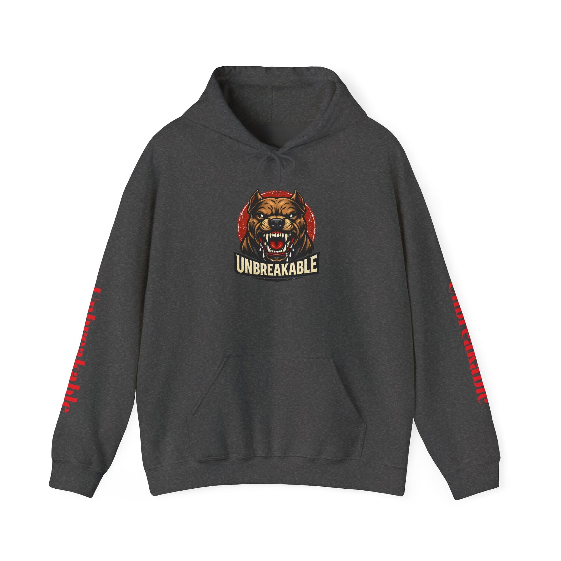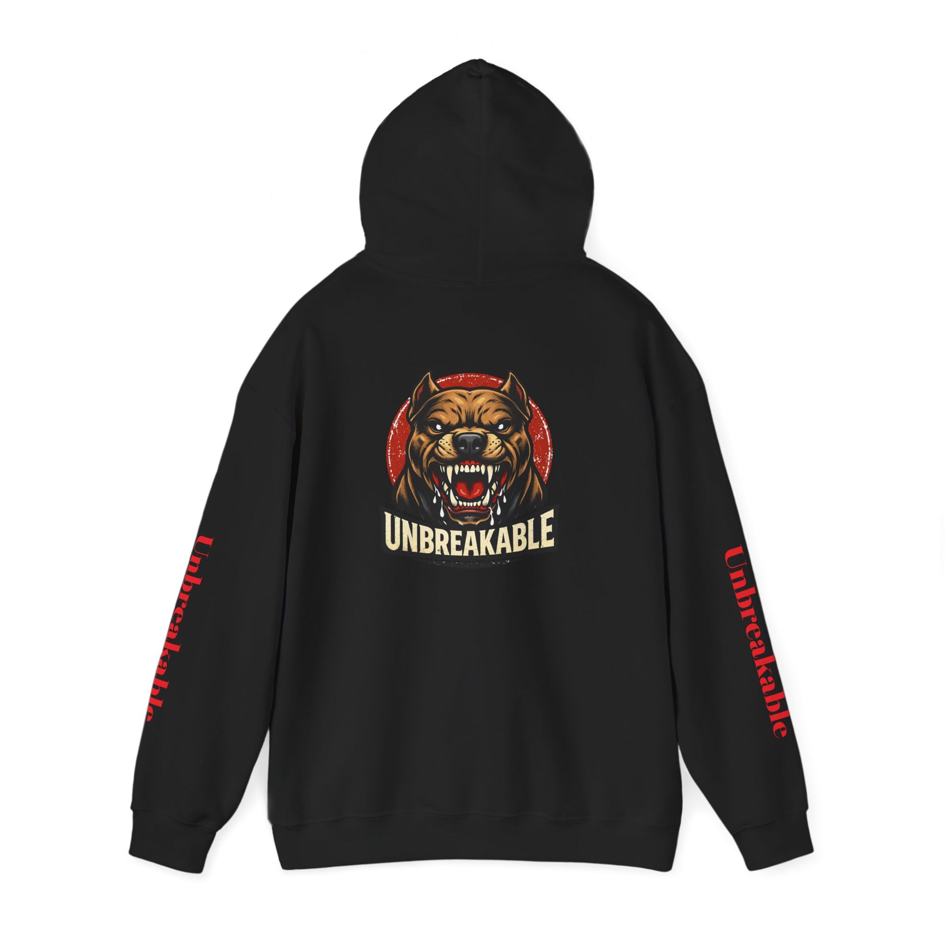 This heavyweight hoodie brings gritty, street-ready energy to chilly days. Centered on the chest and back is a snarling wolf/bear crest framed by a blood-red moon and the bold word “UNBREAKABLE.” Sleeve text in contrasting sunset tones runs down both arms for an athletic, varsity feel. The roomy kangaroo pocket and double-lined hood make it a worn-in companion for late-night walks, band practices, or city skate sessions. Wear it layered over a flannel or under a coach jacket — it anchors outfits with an unapologetic, resilient attitude.